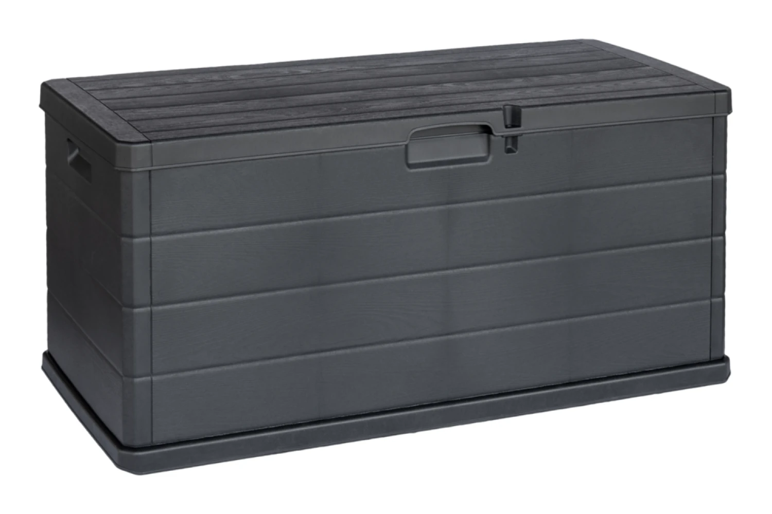 340 litrų talpos juoda plastikinė dėžė – puikus sprendimas tvarkingai terasai.