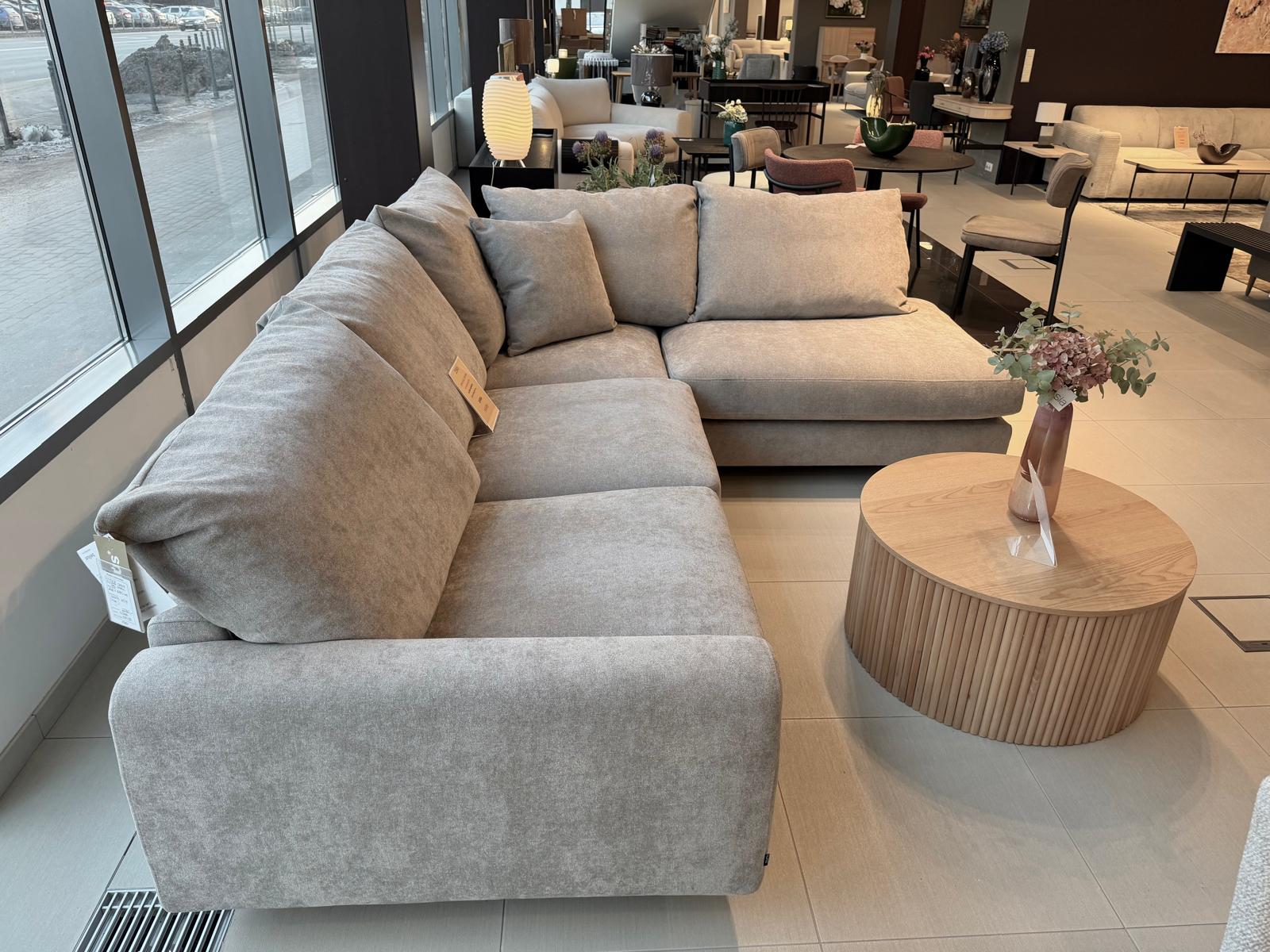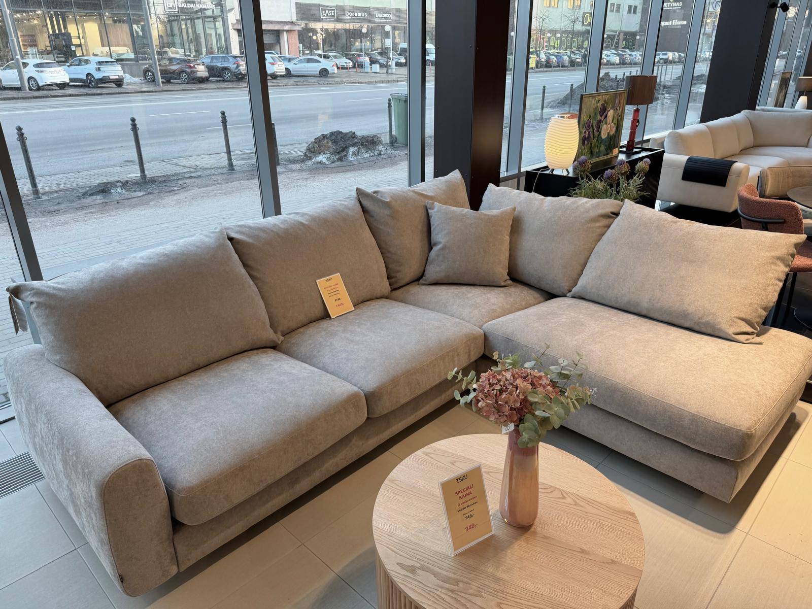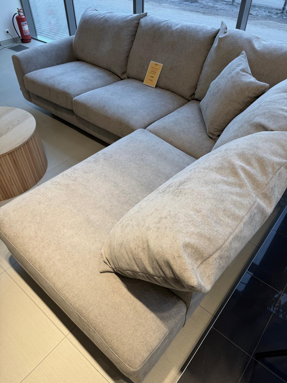 Erdvus didelis kampas iš Kauno salono ekspozicijos su specialia kaina, be defektų. Pilku austiniu audiniu.