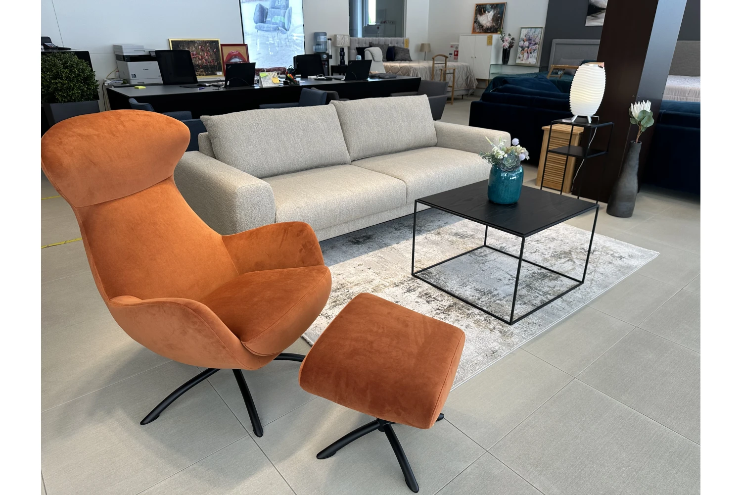 Aukšto kokybinio lygio fotelis Basso su pakoju, vilktas veliūriniu gobelenu. Parduodame iš Kauno salono su spec.kaina.