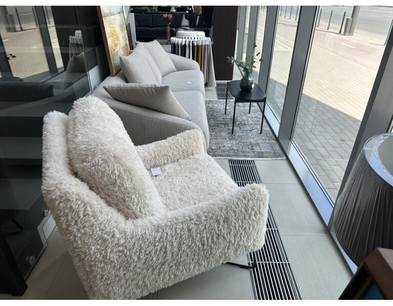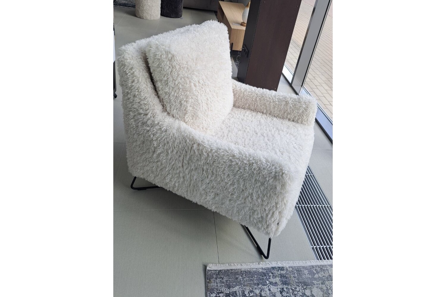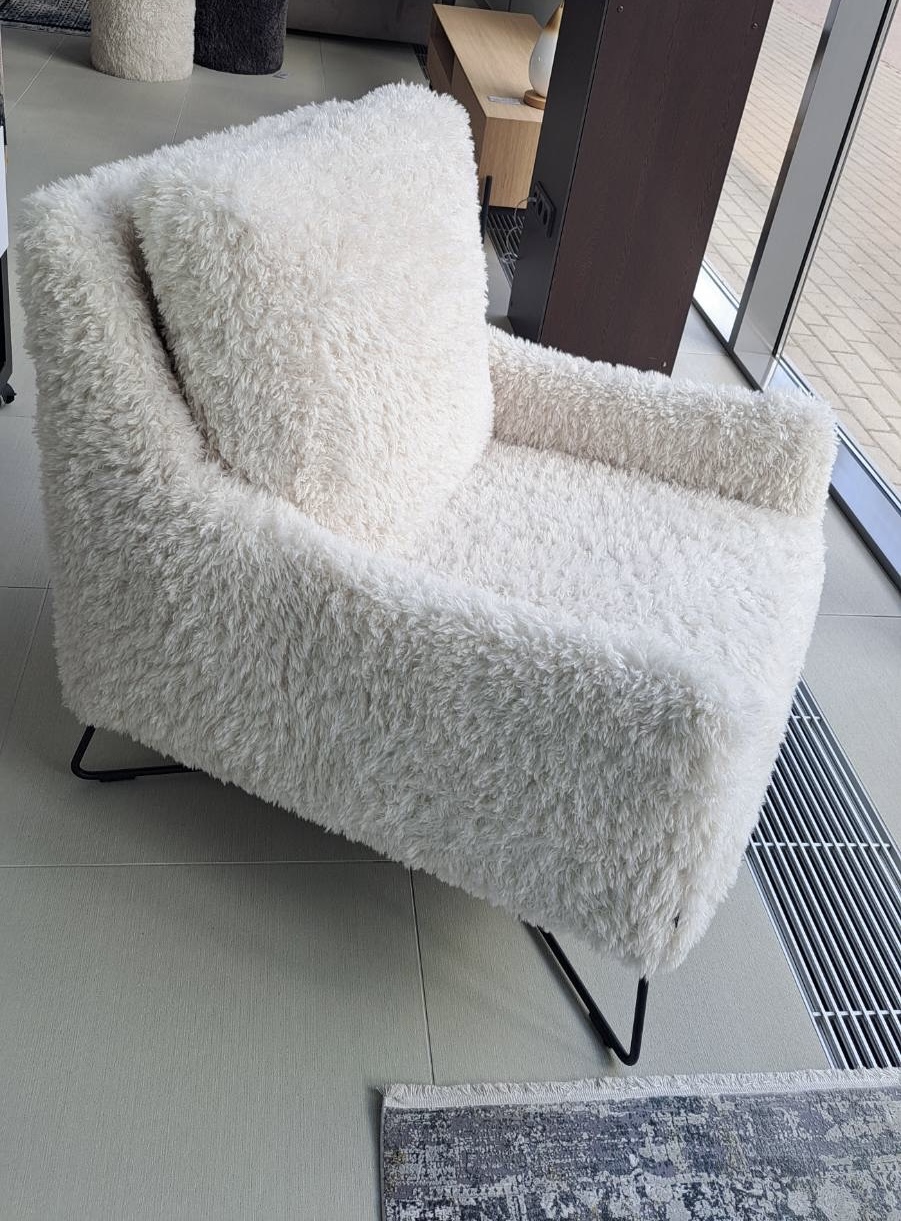 Dailus, kompaktiškas fotelis su kailio imitacijos gobelenu, baltos spalvos iš Kauno salono su spec. kaina.
