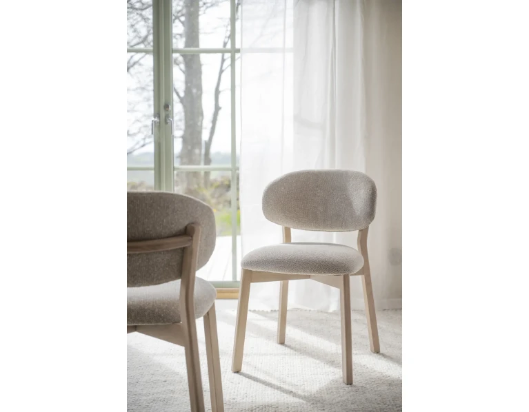 Naujas kėdės modelis – įspūdingas, akiai neįprastas dizainas iš Švedų partnerio. Masyvios tvirtos kojos, užapvalintos visos medinės dalys su skalndžiai susiliejančiu šviesiu audiniu.