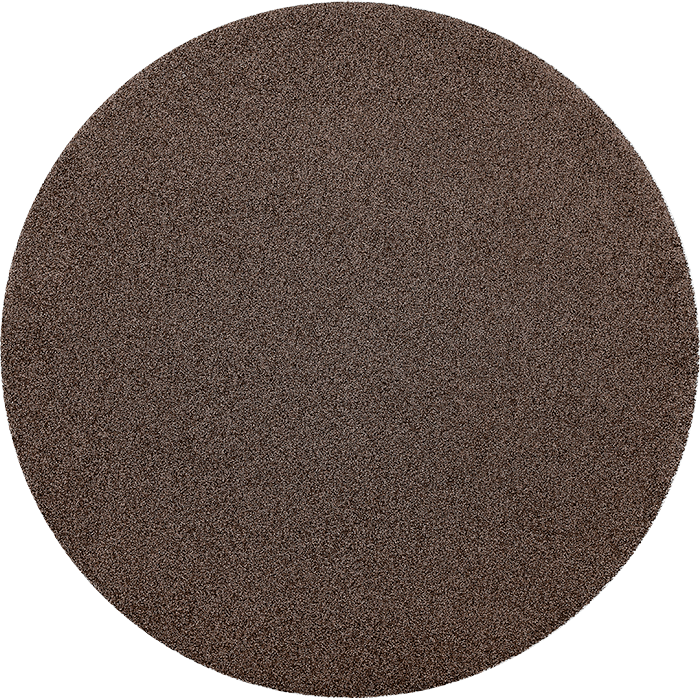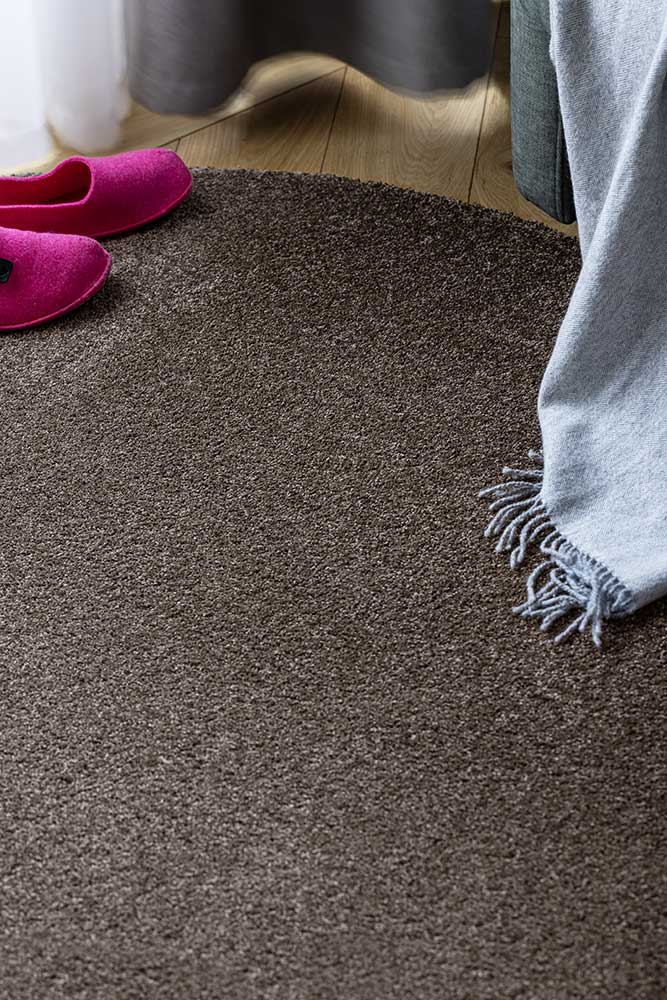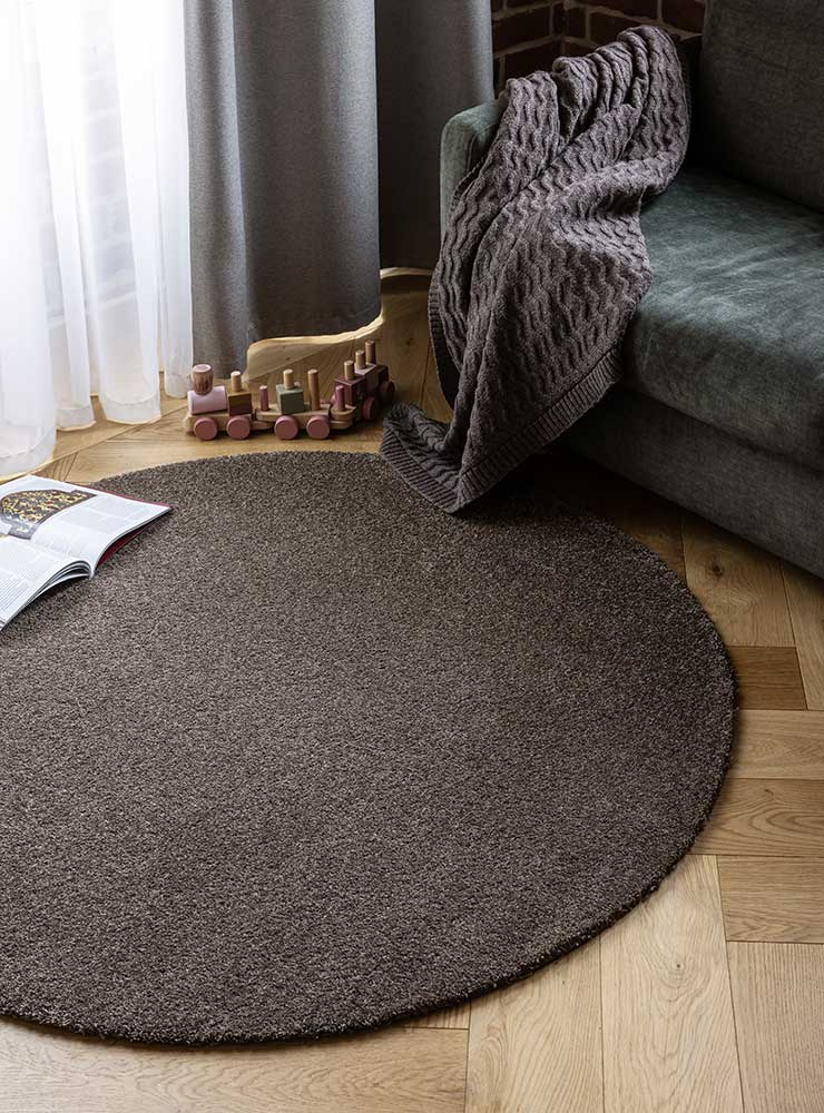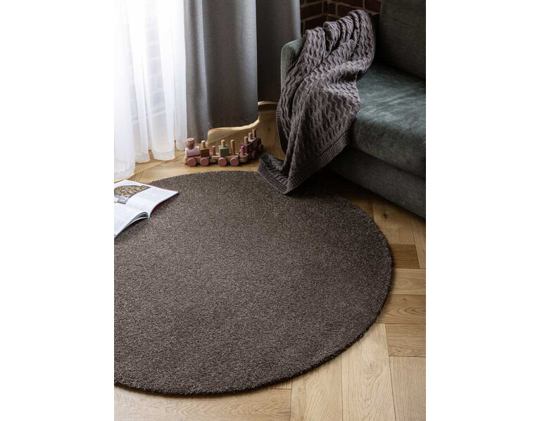Kilimas Jazz Round brown – dviejų dydžių kirpto plauko kilimai iš poliesterio pluošto.