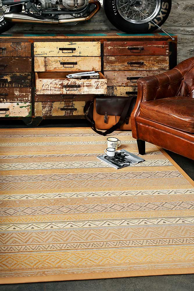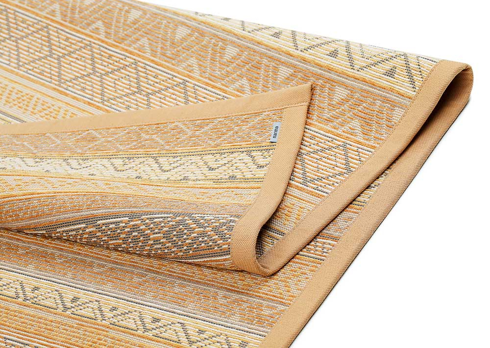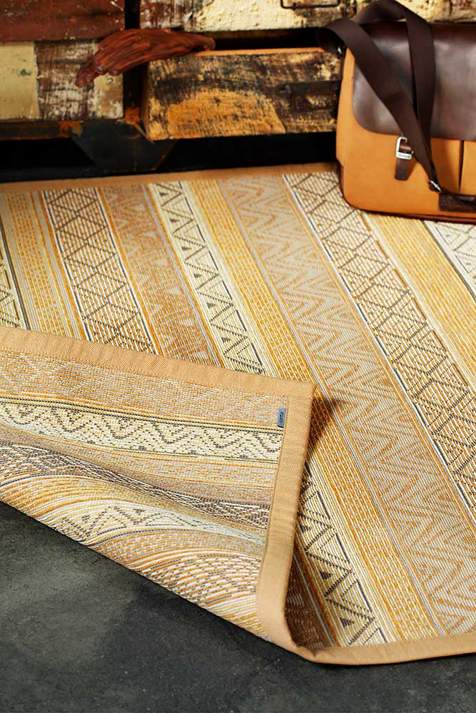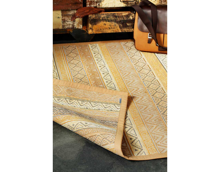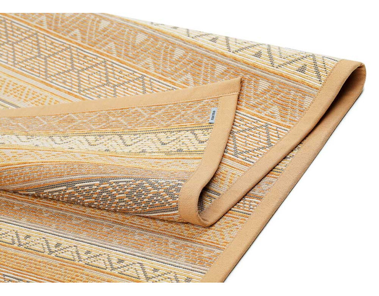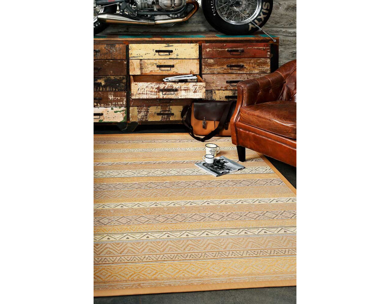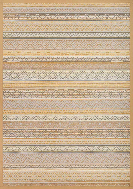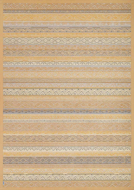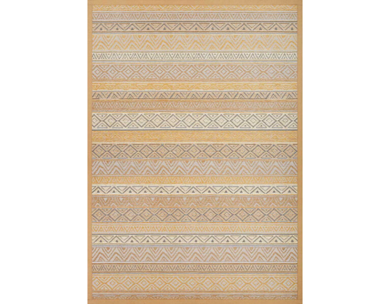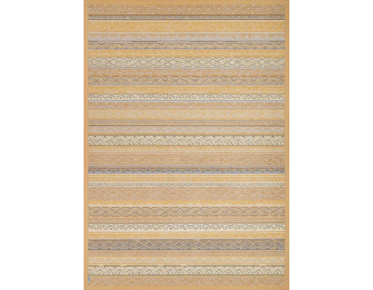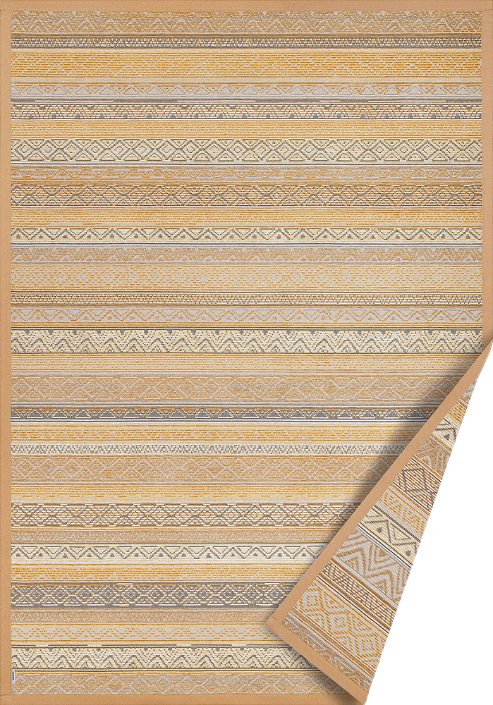 Dvipusis kilimas Ridala kolekcijos, Gold spalva, dekoruota horizontaliai išdėstytais įvairių formų raštais.