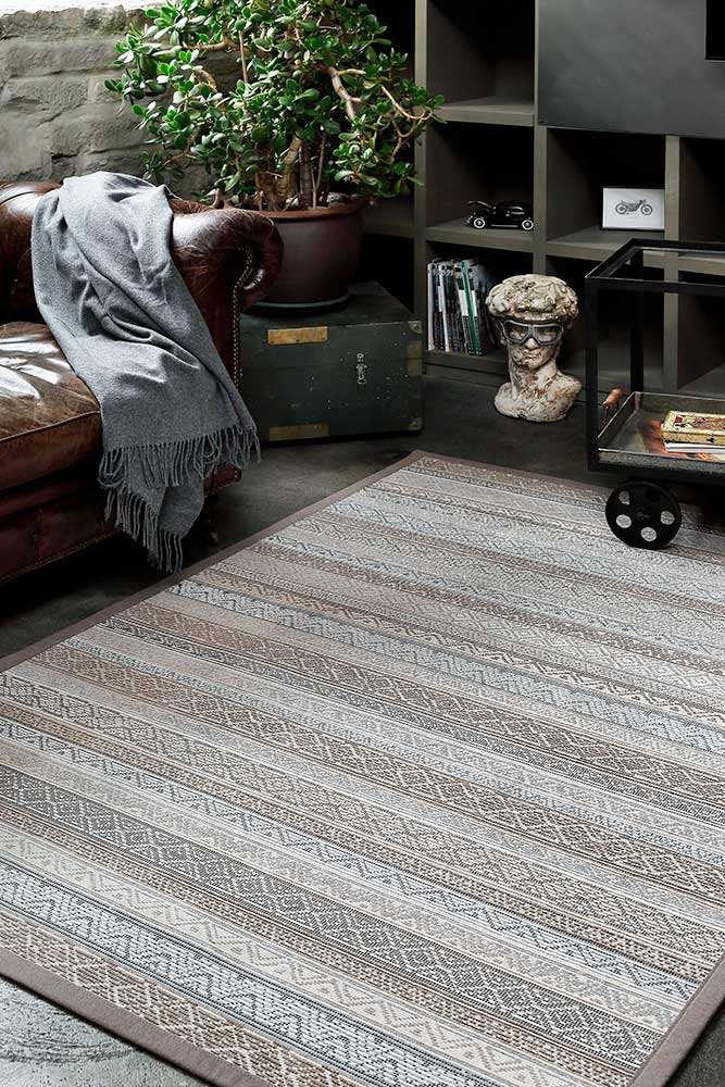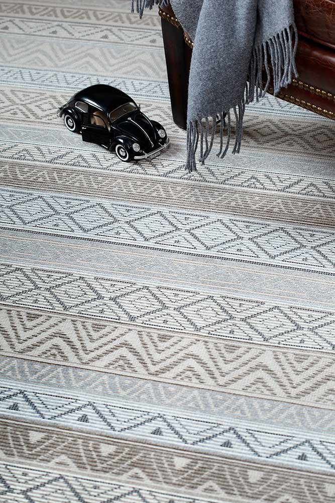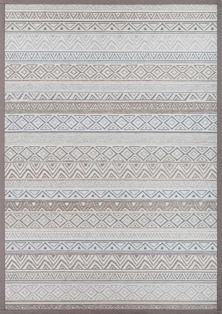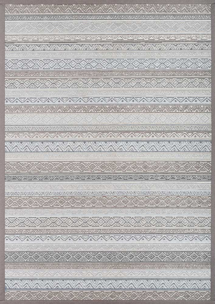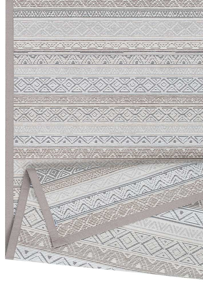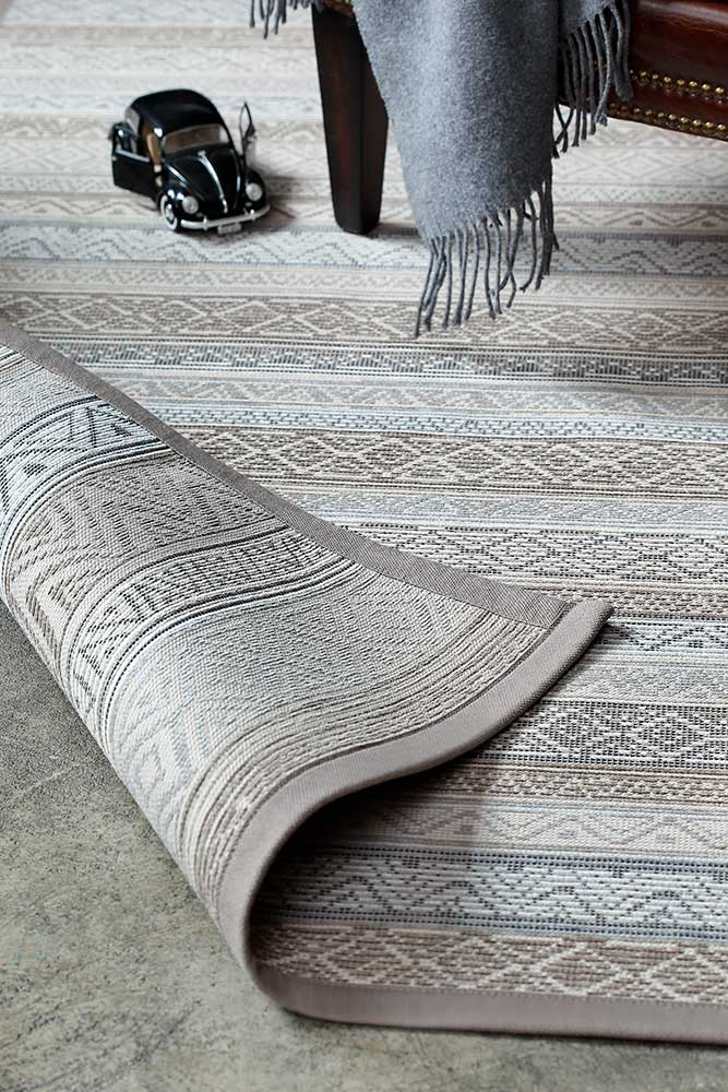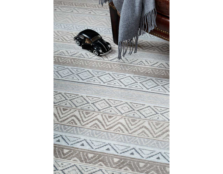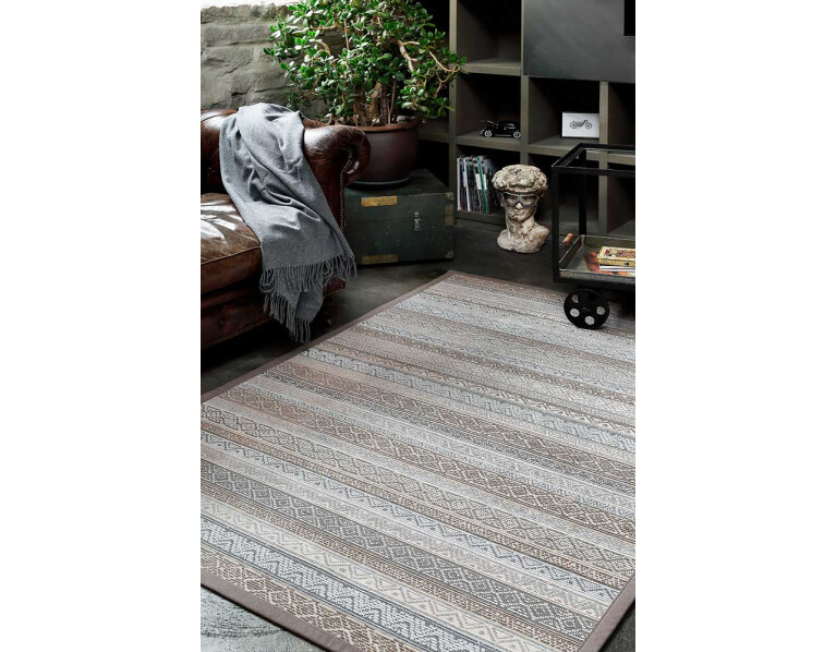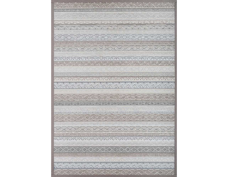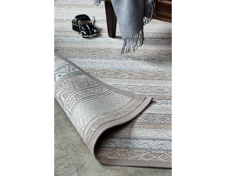 Dvipusis kilimas Ridala kolekcijos, Linen spalva, dekoruota horizontaliai išdėstytais įvairių formų raštais.