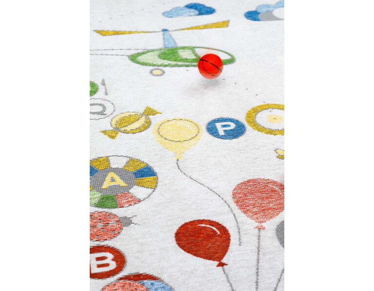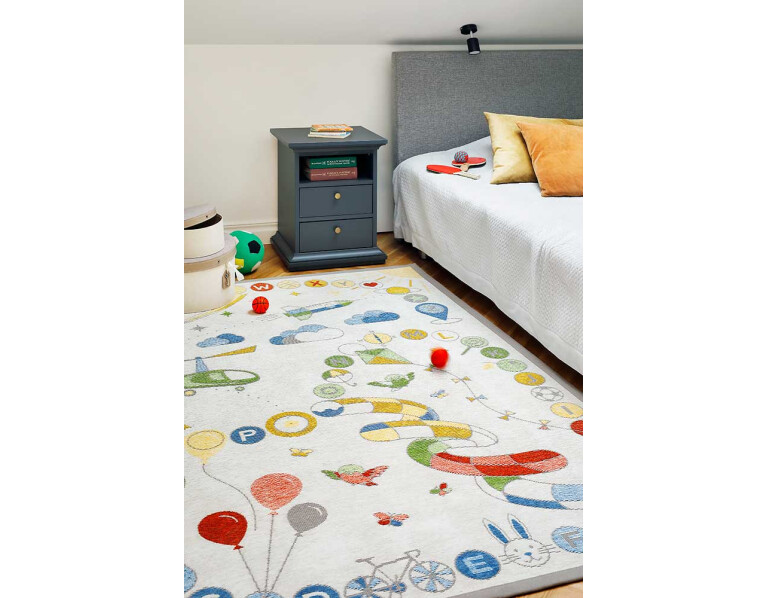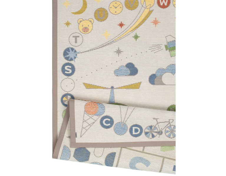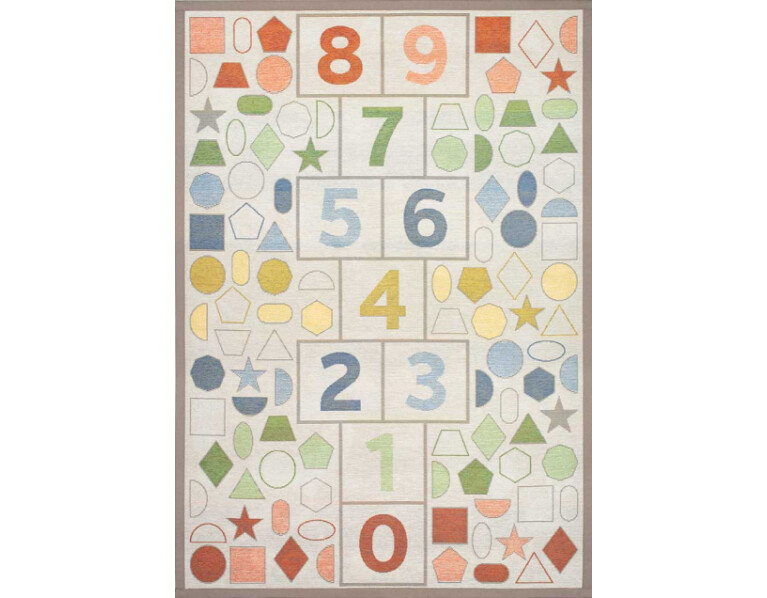 Modernaus dizaino žaismingas kilimas Tähemaa cream vaikų kambariui. Dvipusis su įvairių geometrinių formų raštais ir skaičiais vienoje pusėje, kitoje – dailiu vaikiškų elementų piešiniu. Tiks tiek mergaitei, tiek berniukui.
