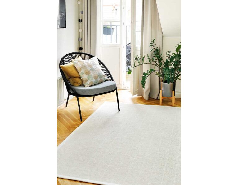 Modernaus dizaino kilimas Tali white dvipusis, nežymiu, monochromišku raštu.