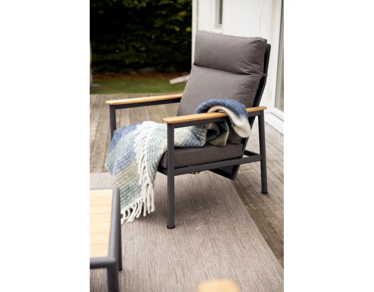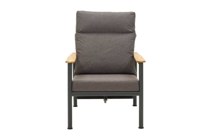 Visada madinga antracito spalva su rudais minkštųjų dalių audiniais, lengvo, bet tvirto aliuminio rėmas, atramos rankoms dekoruotos tikmedžio mediena – suteikia maksimalų komfortą ir grožį. Tobulas baldas kokybiškam vasaros poilsiui!