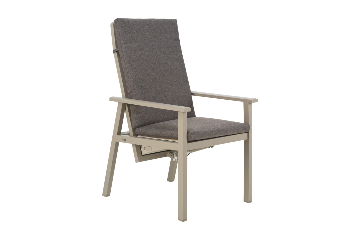 Visada madinga chaki spalva, lengvo, bet tvirto aliuminio rėmas, rusvos spalvos minkštos ir patogios pagalvės, atramos rankoms suteikia maksimalų komfortą. Tobula vieta kokybiškam vasaros poilsiui!
