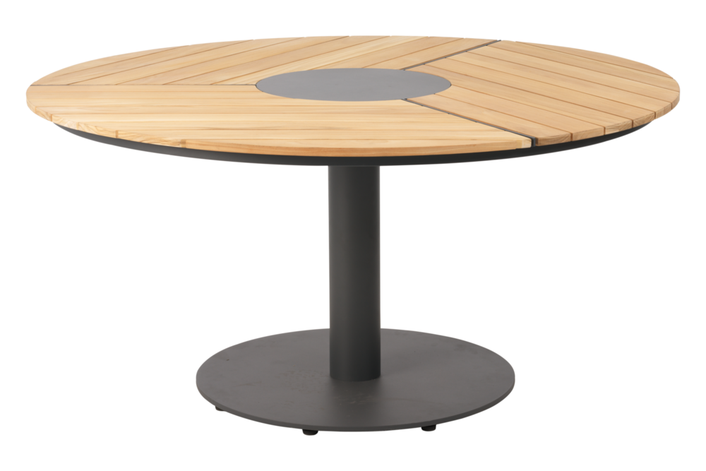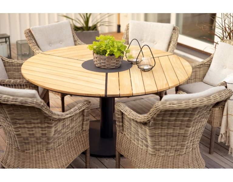 Apskritas didelis valgomojo stalas Peace antracito pilkos spalvos su tikmedžio detalėmis – skirtas lauko terasoms ir ne tik. Šiemet turime platesnį pasirinkimą Peace serijos stalų. Naujiena – net 150 cm skersmens valgomojo stalas su tikmedžio stalviršiu. Suteikia baldui jaukumo, šiltumo. Dizainas iš tiesų elegantiškas ir modernus, neįprastas – stalo centre aliuminio apvali detalė dailiai kontrastuoja su medine dalimi.