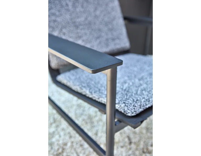 Medžiagos: juodos spalvos aliuminio rėmas, tekstilenas ir perdirbtas poliesteris minkštosioms dalims apvilkti, antracito spalvos.