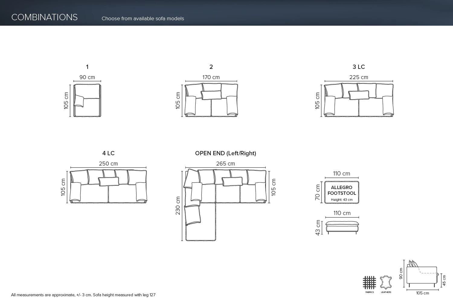 Allegro serijoje yra fotelis, pufas bei 4 dydžių sofos (žiūrėti galerijoje, viena iš jų kampinė).