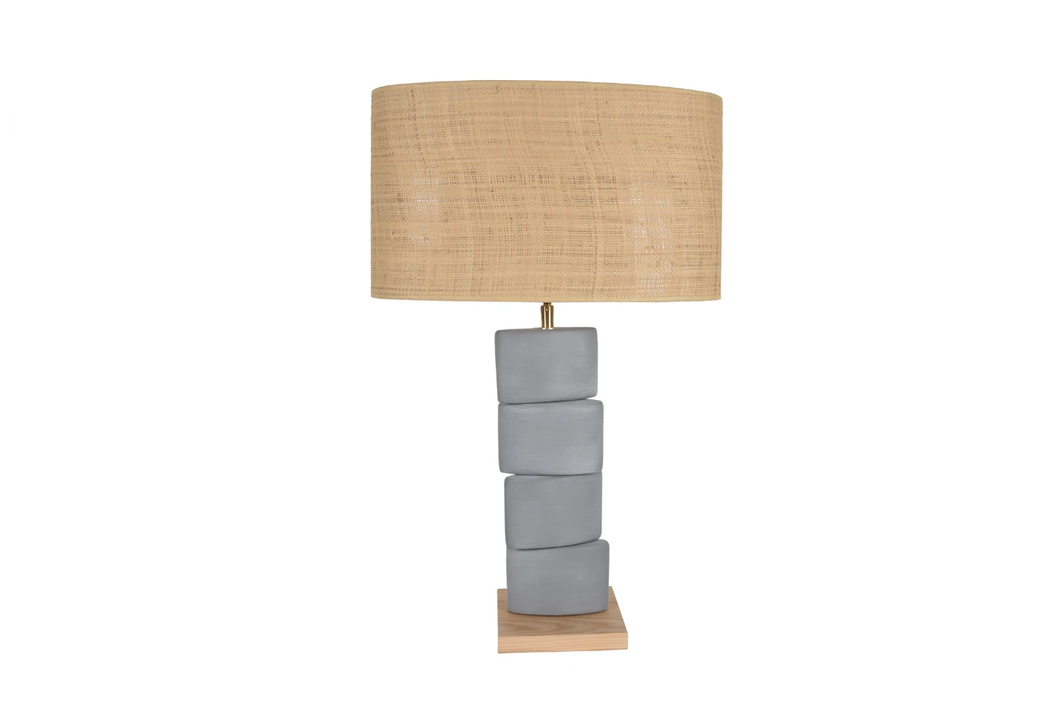 Pagrindas su medžio ir kermikinėmis detalėmis, gaubtas iš rafijos.