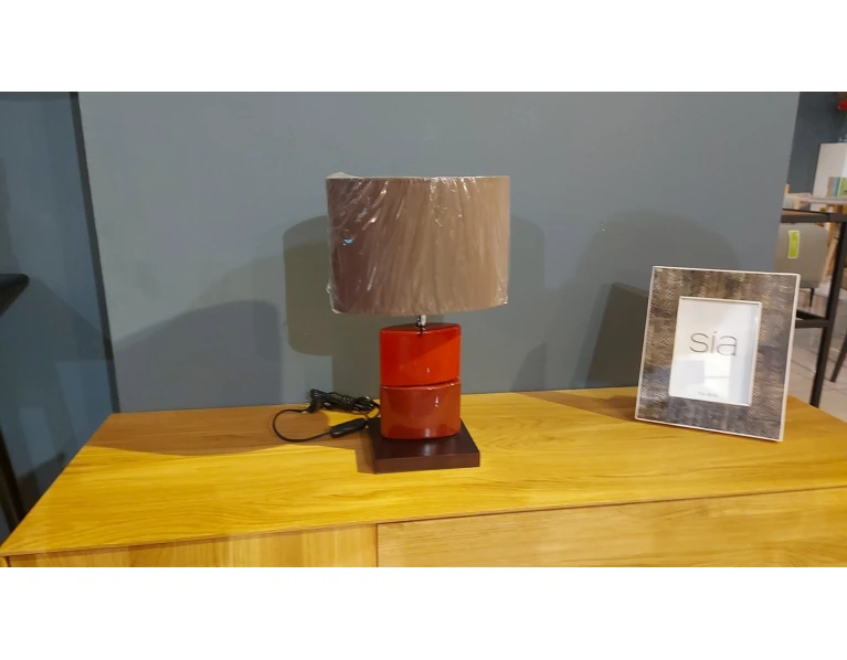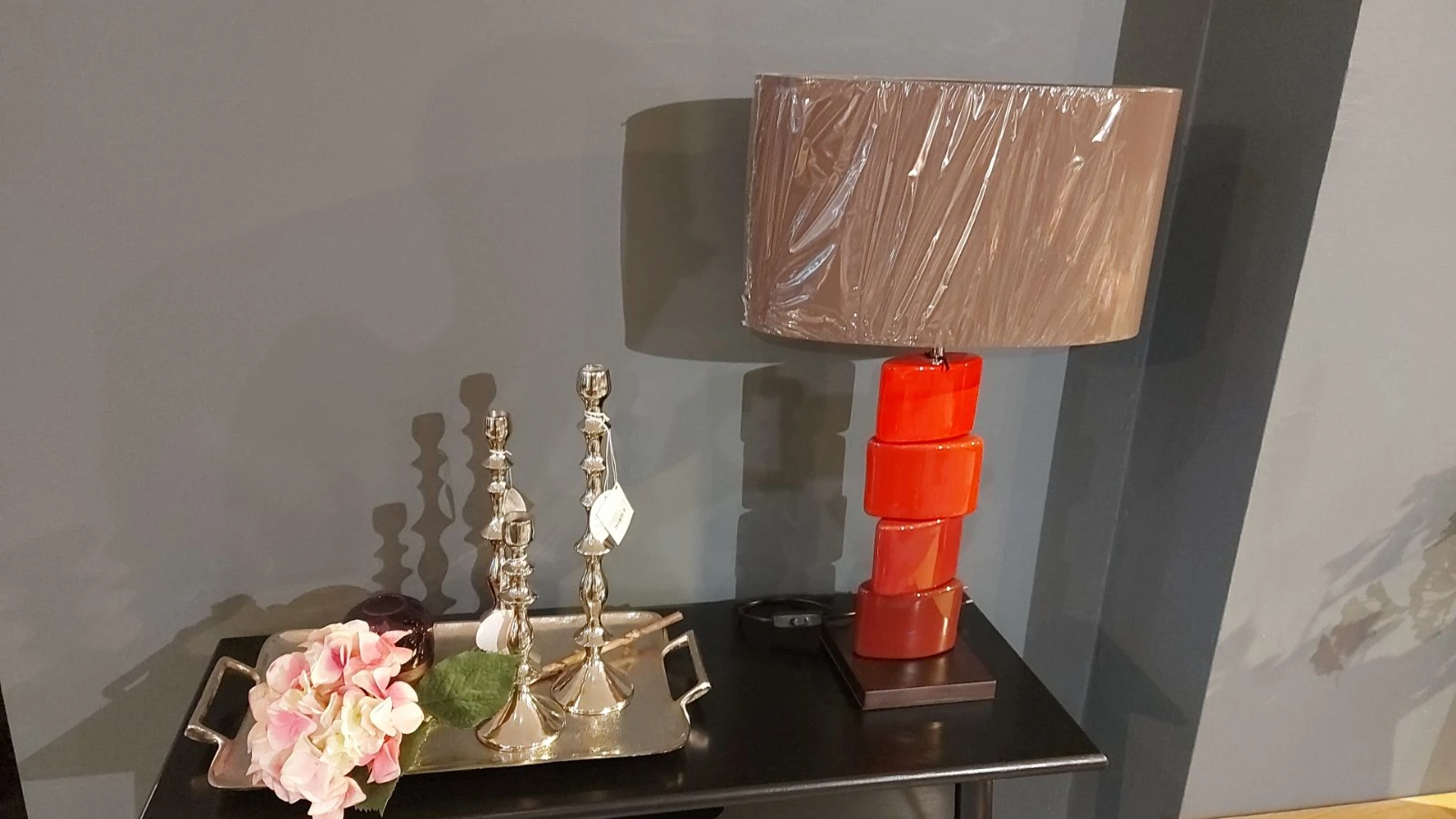 Šviestuvas Chanela Red iš ekspozicijos Vilniuje, su rusvos/plytų spalvos gaubtu. Stalinis šviestuvas.