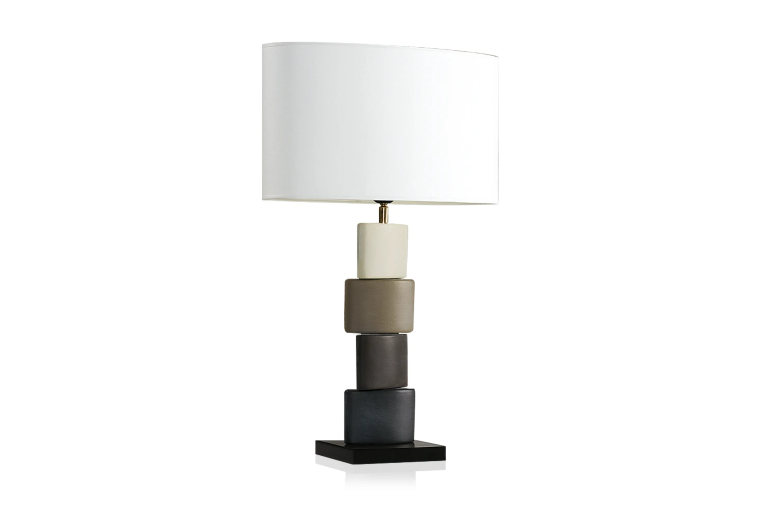 Šviestuvas Minea su baltos spalvos gaubtu ir rusvų tonų keramikinėmis detalėmis. Stalinis šviestuvas. Yra ir analogiška žemesnis Minea šviestuvas