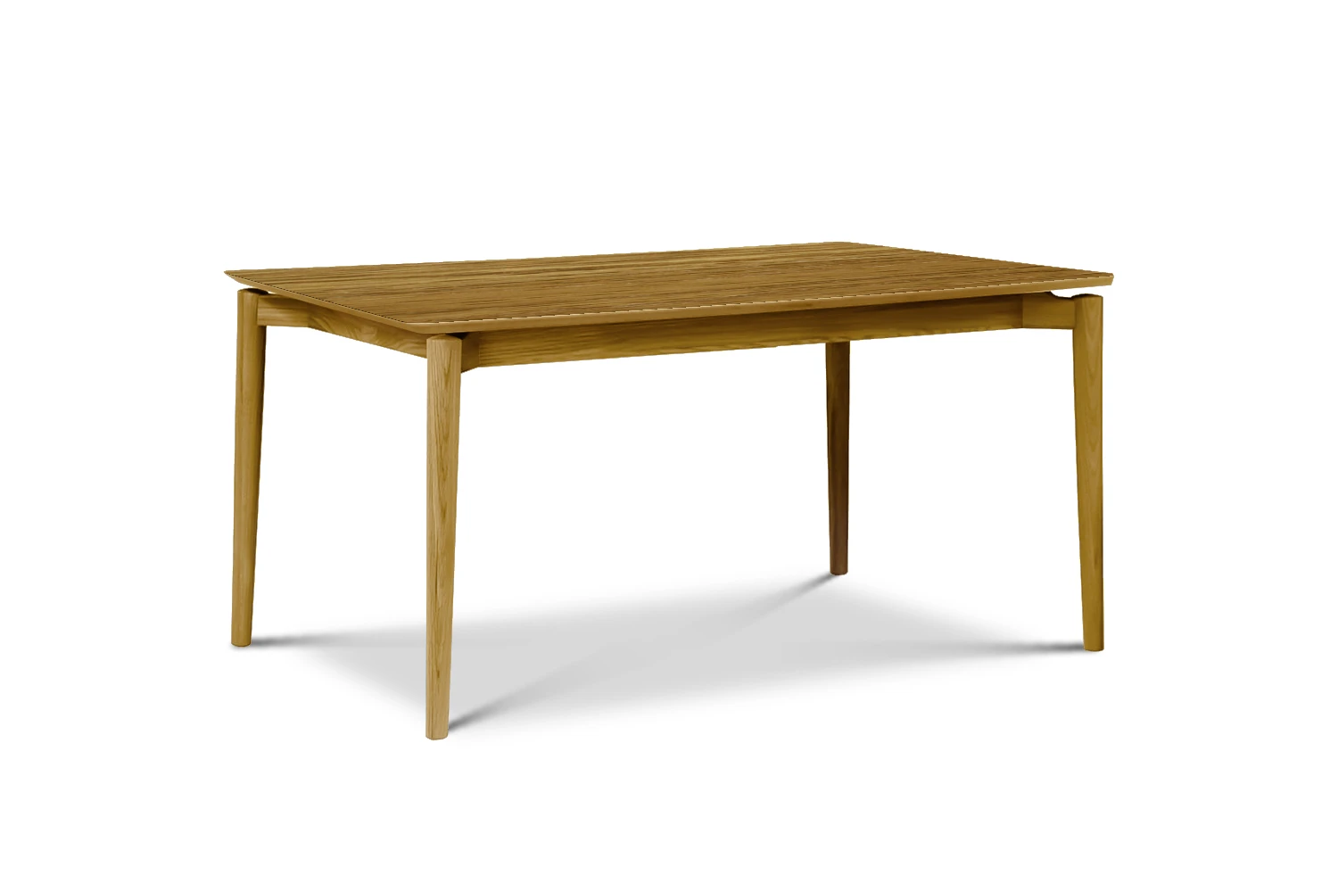 Pažvelkime į šį neeilinio dizaino kūrinį iš arčiau. Pagrindinis valgomojo stalo Odense akcentas jo kojų ir stalviršio sujungimas. Tvirtos apvalios medžio masyvo kojos, jungiasi su mediniu stalo rėmu. O pats stalviršis, dailiai siaurėjantis apatinėje plokštumoje, tvirtinasi ant stalo rėmo. Taigi pati stalo kojelė stalviršio neliečia. Tai labai gražus ir elegantiškas dizaino akcentas. Stalviršiui naudojama kokybiška MDF plokštė su ąžuolo faneruotė.