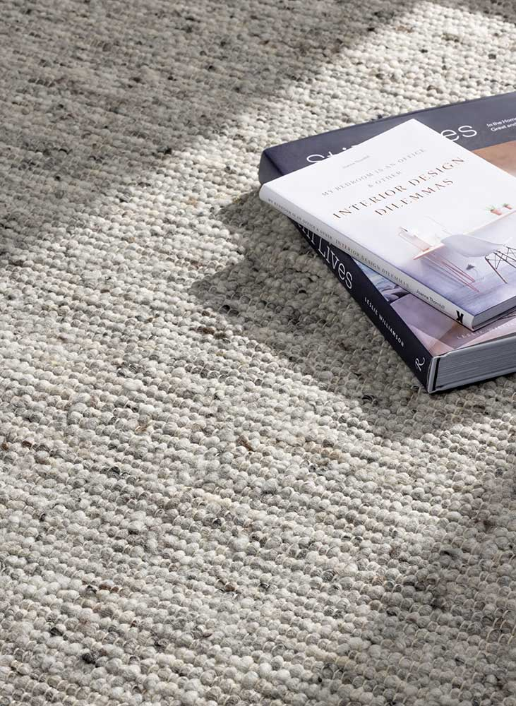 Vilnos kilimai Hygge – natūralumo mylėtojams. Kilimas Hygge grey – pilkos spalvos, turinčios nedažytos vilnos gretimų atspalvių. Kilimas dvipusis, abi piusės panašios.